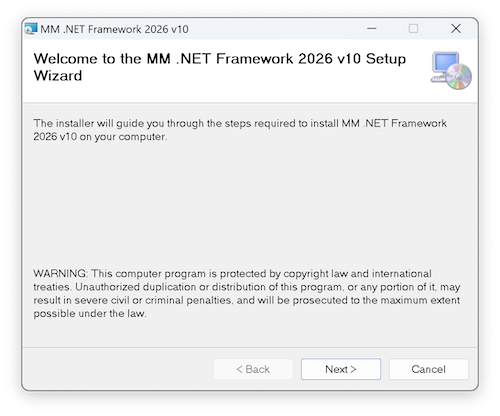 - Run the Microsoft Windows Installer program MM .NET Framework 2026 v10 Installation.msi. This displays the MM .NET Framework installation wizard: